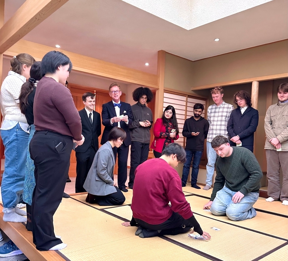 Students from University College Dublin playing Japanese carta (hyakunin isshyu) with Mr. Peter McMillan (photo taken at the residence of Japanese Ambassador on 22 January 2026)