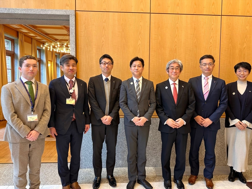 Mayor UESADA Akihito of Matsue City, Japan (centre), Ambassador MIYAGAWA Manabu (thrid from right) and their staff (photo taken at the residence of Ambassador of Japan in February 2026)