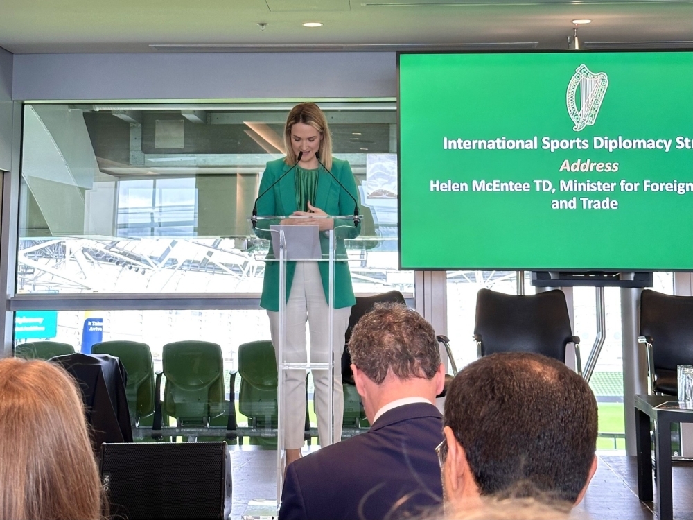 Ms Helen McEntee TD, Minister for Foreign Affairs and Trade, addressing the audience at the launch of International Sports Diplomacy Strategy (photo taken in February 2026)