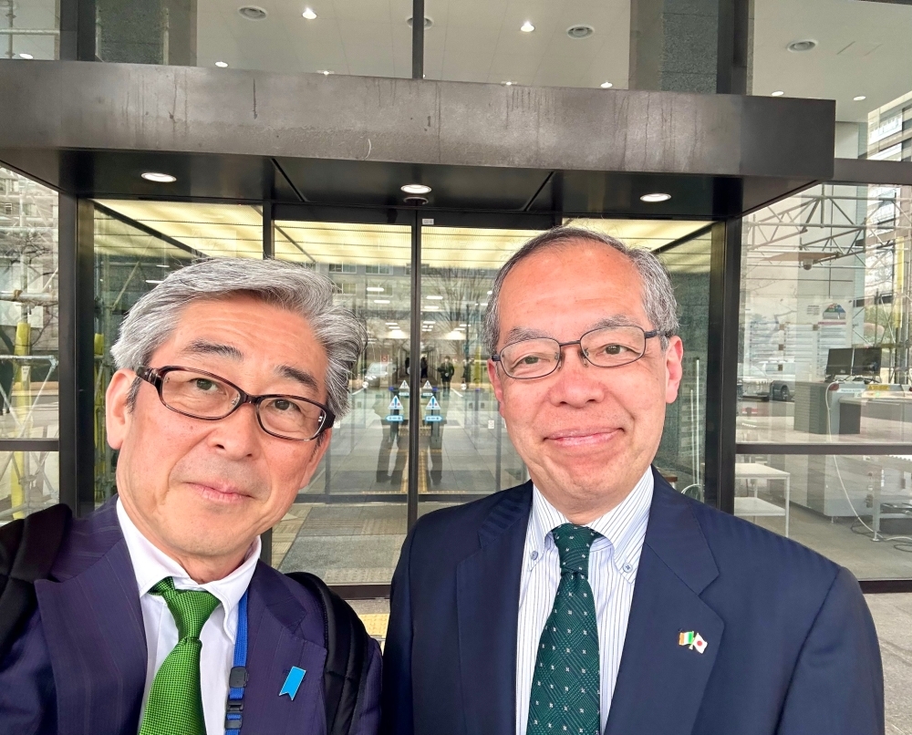 On 19 March, Mr TSUCHIYA Yoshihiro, Vice President of the IJCC, visited the Ministry of Foreign Affairs and exchanged views with Ambassador MIYAGAWA Manabu to Ireland, who was in Tokyo to attend the meeting of the Japanese Ambassadors in Europe. Both sides discussed preparations for the 70th anniversary of the establishment of diplomatic relations between Japan and Ireland in 2027 and other matters.