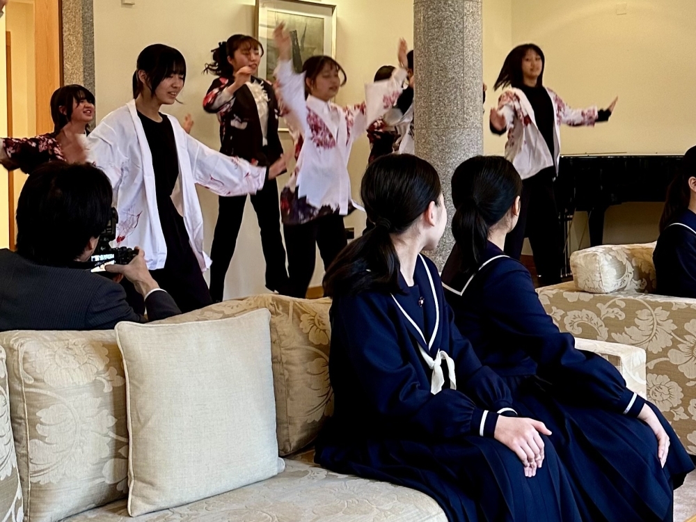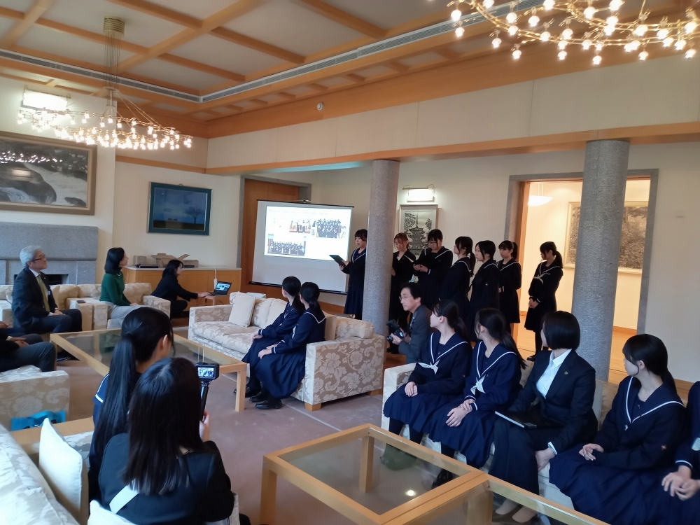 On 23 March, students from the harp clubs of Kinjo Gakuin Junior/Senior High School and Kinjo Gakuin University in Aichi Prefecture, Japan paid a courtesy call on Ambassador MIYAGAWA Manabu and his wife at their official residence. The students performed beautiful songs on the harp along with an impressive slideshow presentation in English about their school and Japan, followed by a demonstration of the harp by their teacher and performance of the Soran Bushi, a traditional Japanese folk song of fisherman. The schools were visiting Sligo and Portlaoise to engage with local communities through the harp.