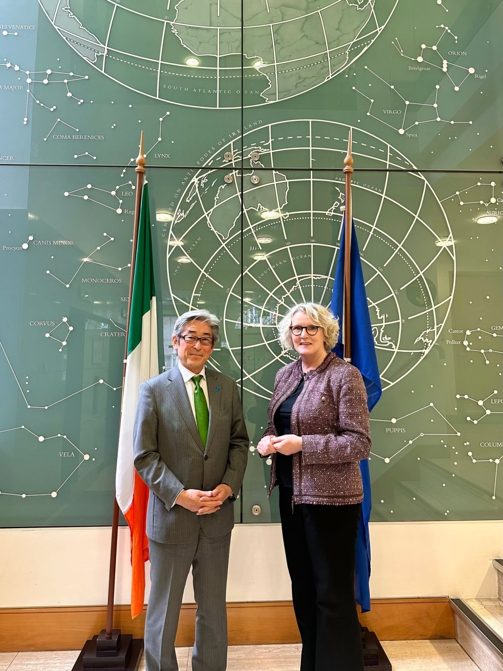 On 9 April, Ambassador MIYAGAWA Manabu paid a courtesy call on Ms. Síle Maguire, Director General, Corporate Services and Human Resources Divisions, at the Department of Foreign Affairs and Trade. She has been Ambassador to Ethiopia, Spain, and Nigeria previously and experienced various senior roles both in Dublin and overseas.