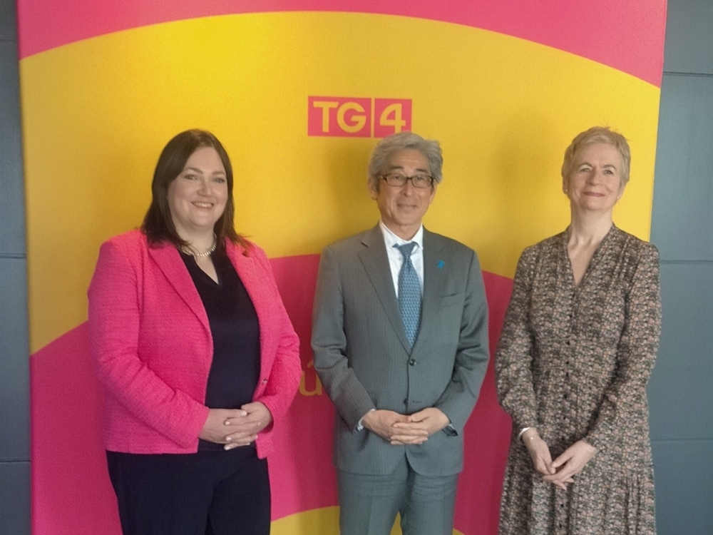 On 13 April, Ambassador MIYAGAWA Manabu and his wife Mrs MIYAGAWA Noriko, together with Mr Dáithí Ó hAodha, Public Relations and Culture Assistant at the Embassy of Japan in Ireland, visited TG4. They met with Director General Ms Deirdre Ní Choistín, Chairperson Ms Anna Ní Ghallachair, as well as other executives and staff members of TG4.