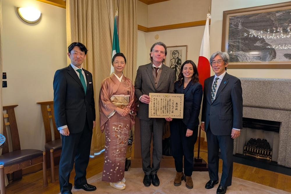2月12日、宮川学大使は、大使公邸において、コーク県出身の造形作家であるジョセフ・ウォルシュ氏に対し、在外公館長表彰を行いました。世界的に有名な造形作家である同人は、日・アイルランド外交関係樹立60周年記念展などの開催、二国間の建築分野における審査員就任のほか、同人主催の世界中の造形作家が集う年次ワークショップ「Making In」には、 日本人の造形作家も定期的に参加しており、両国の造形作家にとって貴重な文化交流となっています。