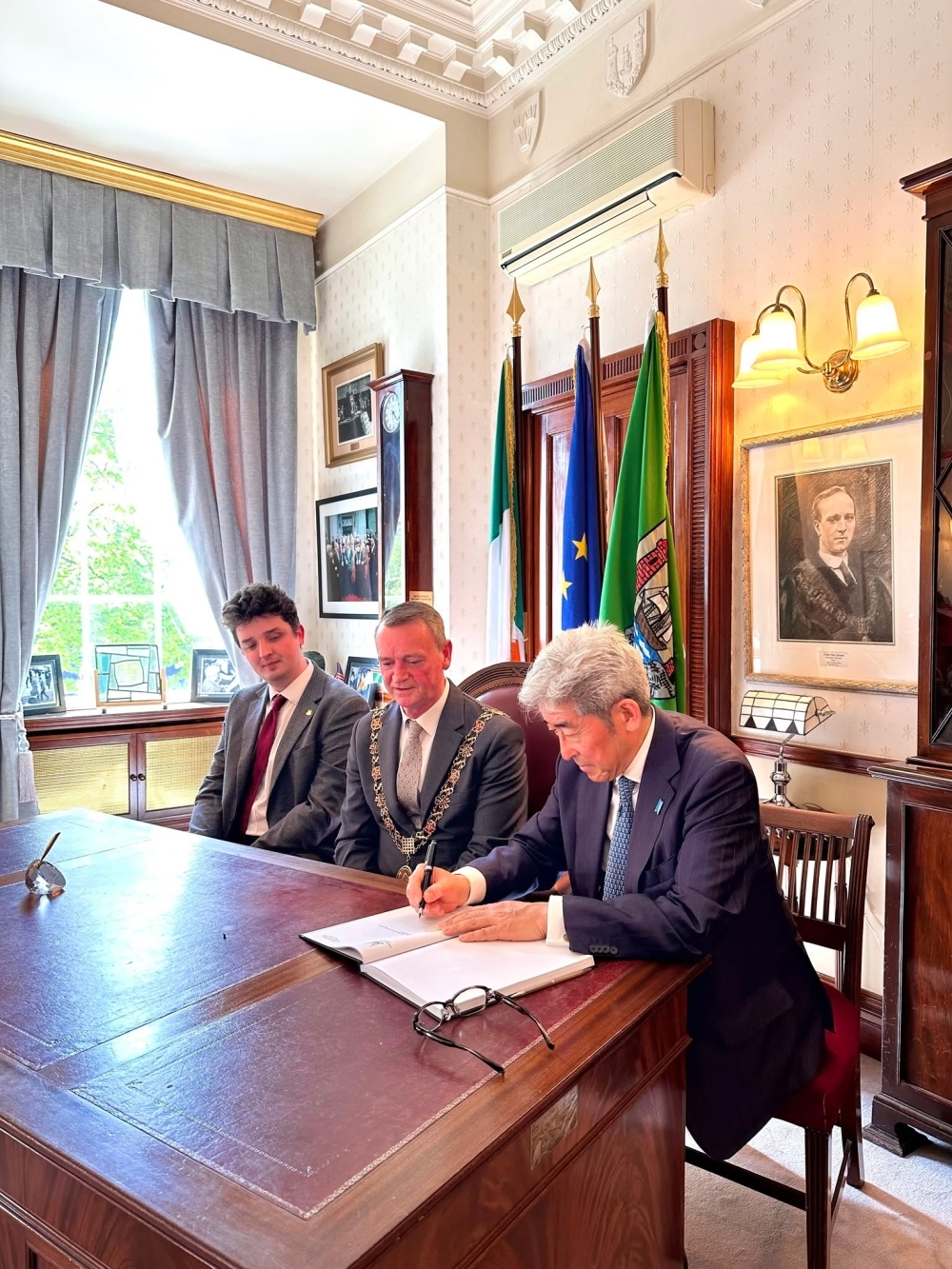 ファーガル・デネヒー・コーク市長(中央)、キアラン・ケレハー・バーン・コーク市国際部員(左)、記帳する宮川学大使(右)